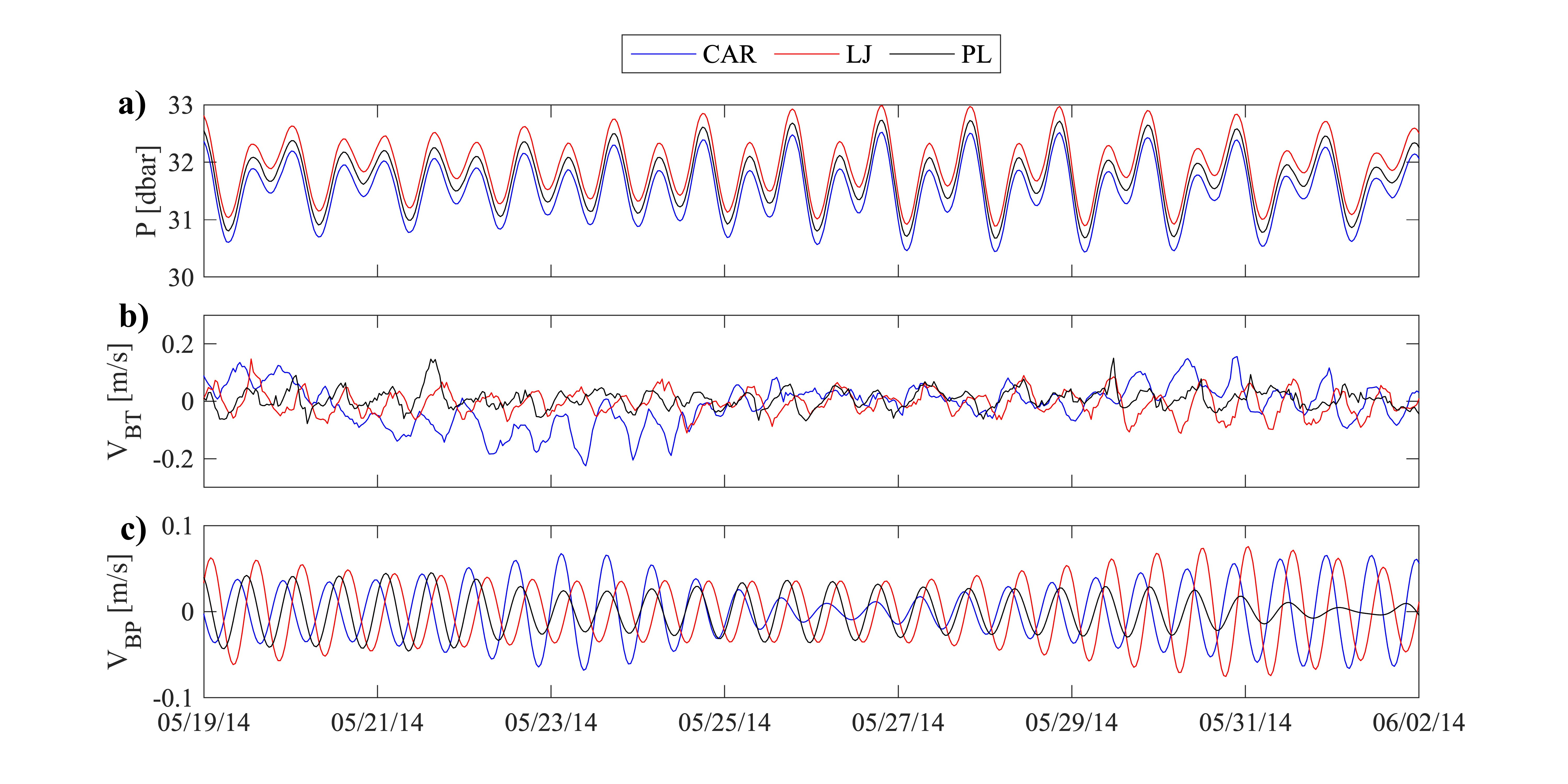 But since 1970, multiple studies here and elsewhere have seen weird discrepancies between measured currents and the height of the passing tide. If tides alone drove the currents, we'd expect the alongshore current to be neatly in-phase with pressure - the strongest northward current occurring at high tide. Numerous times, this wasn't the case.