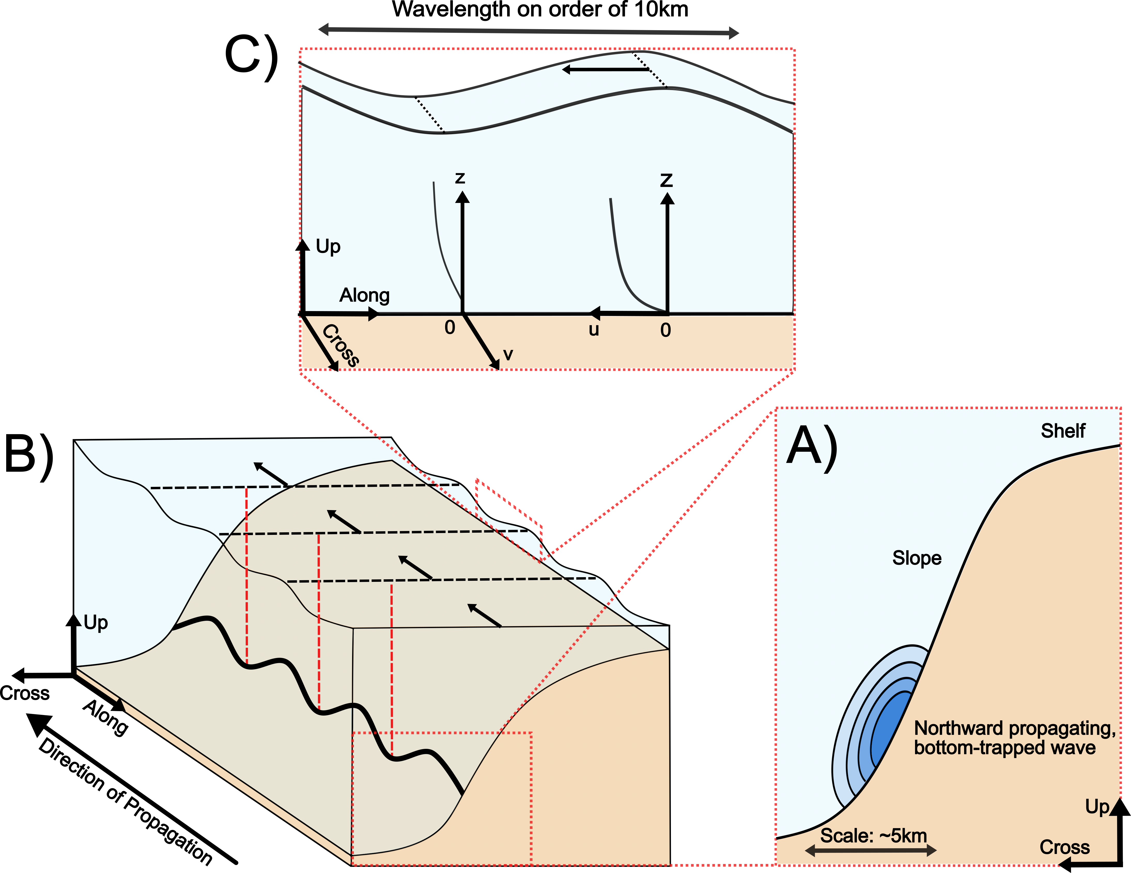 When these internal waves encounter the sloping seafloor on the outer slope of the continental shelf, at roughly 300-500 meters depth in our case, they can become trapped by a balance of refraction and rotation, propagating along the coastline as coastal trapped waves and influencing the currents on the inner shelf. These trapped waves maintain the twice-daily rhythm but create current patterns that don't match the surface tide timing. We called this the "quasi-barotropic" component - essentially the part of the current that looks like it should be driven by tides but isn't.