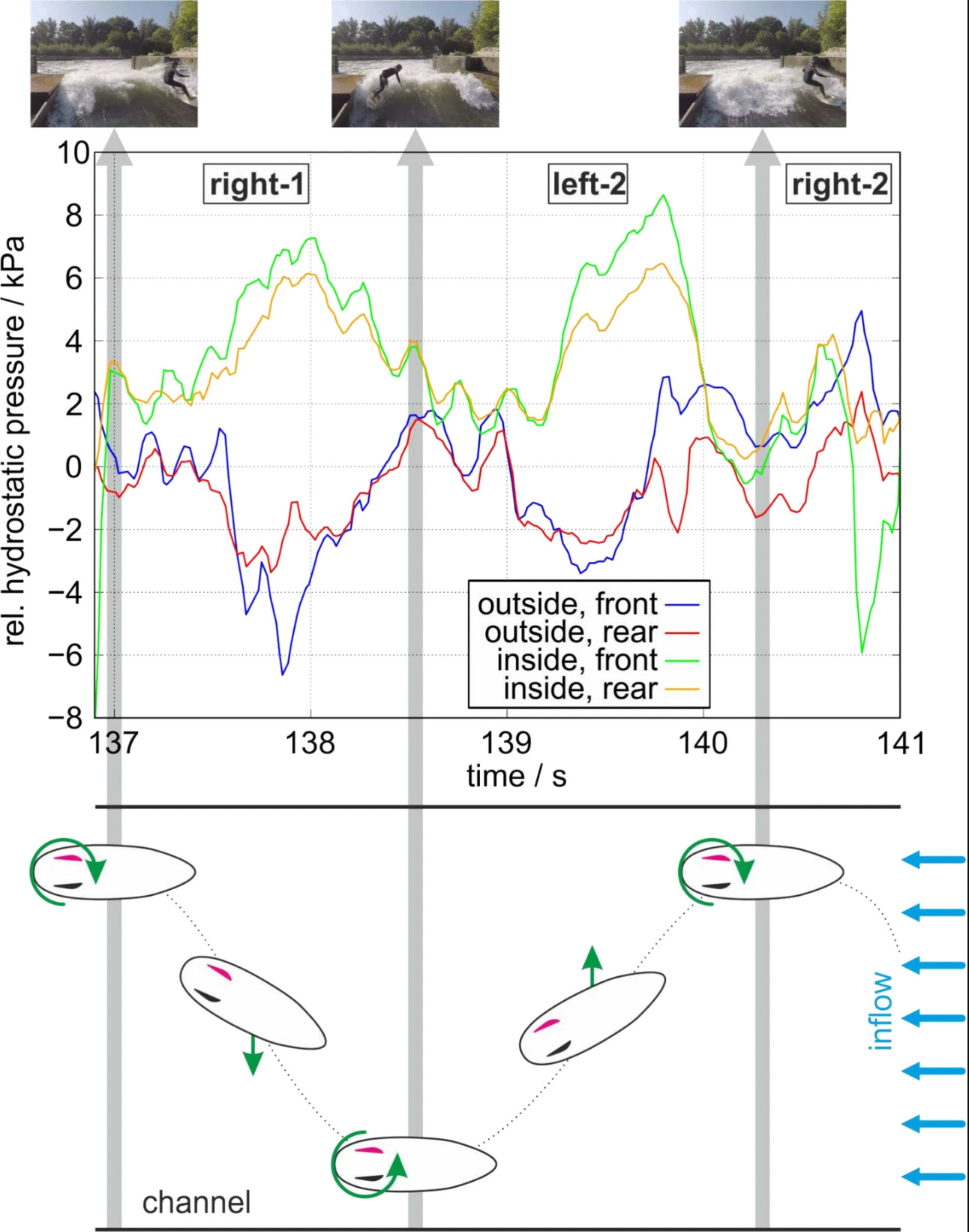 River waves offer something ocean waves can’t: consistency. The Fuchslochwelle holds its shape hour after hour, allowing the surfer to repeat the same maneuver multiple times under nearly identical conditions. The wave itself runs about a meter tall with flow velocities around 4 m/s, fast enough to surf but controlled enough for meaningful data collection. A certified river-ripper took the board through three complete cycles, carving from one side of the channel to the other and back, executing the kind of drawn-out turns that river surfing demands. Between runs, the team checked the waterproof box, confirmed the sensors were recording, and watched the pressure traces accumulate on the memory card.
